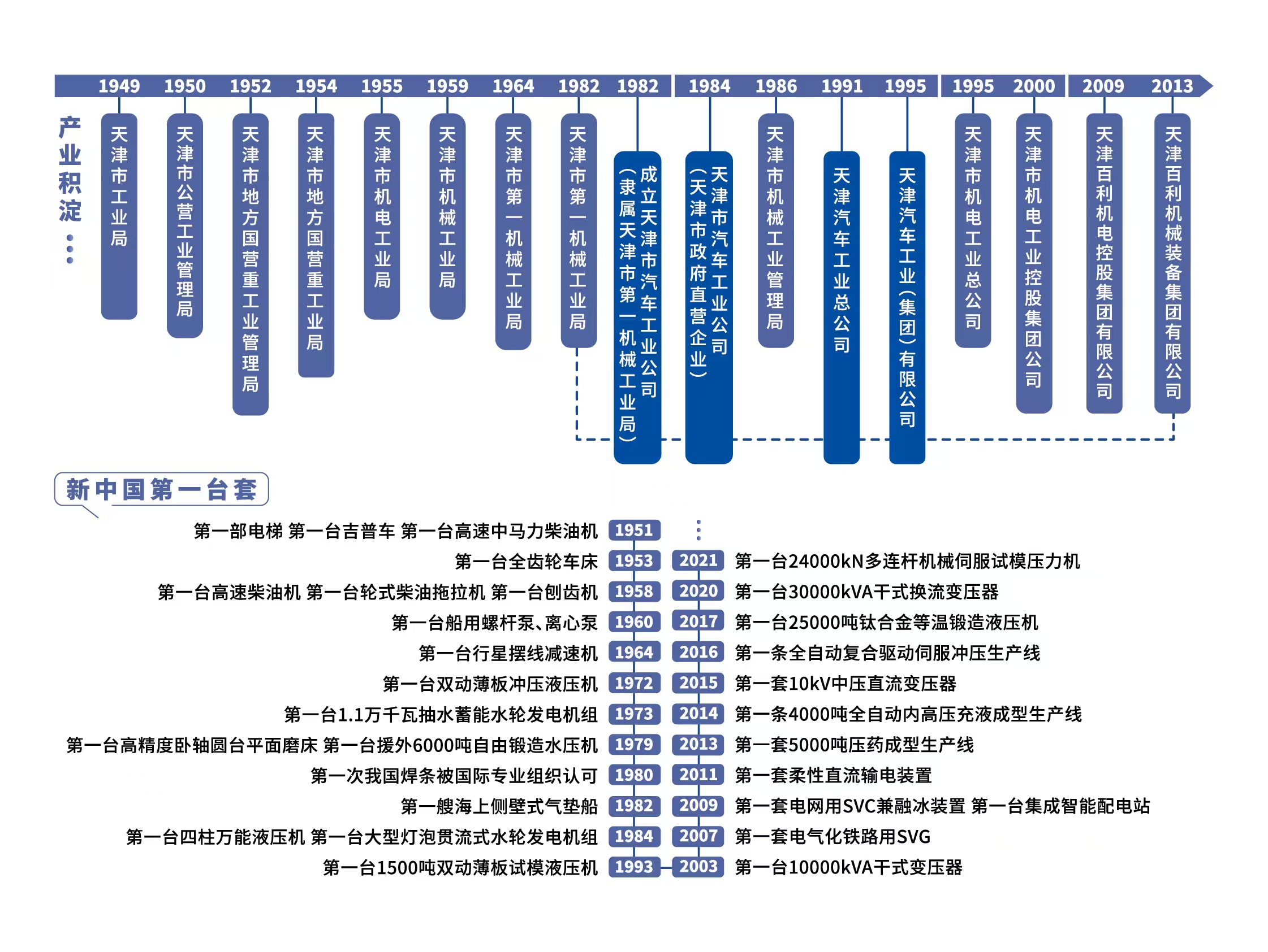 集團(tuán)前身是1949年成立的天津市工業(yè)局,2013年由原天津百利機(jī)電控股集團(tuán)有限公司和原天津汽車工業(yè)(集團(tuán))有限公司重組整合而成,是天津市屬國有獨(dú)資公司,中國機(jī)械裝備行業(yè)的骨干企業(yè),注冊(cè)資本57.2億元。